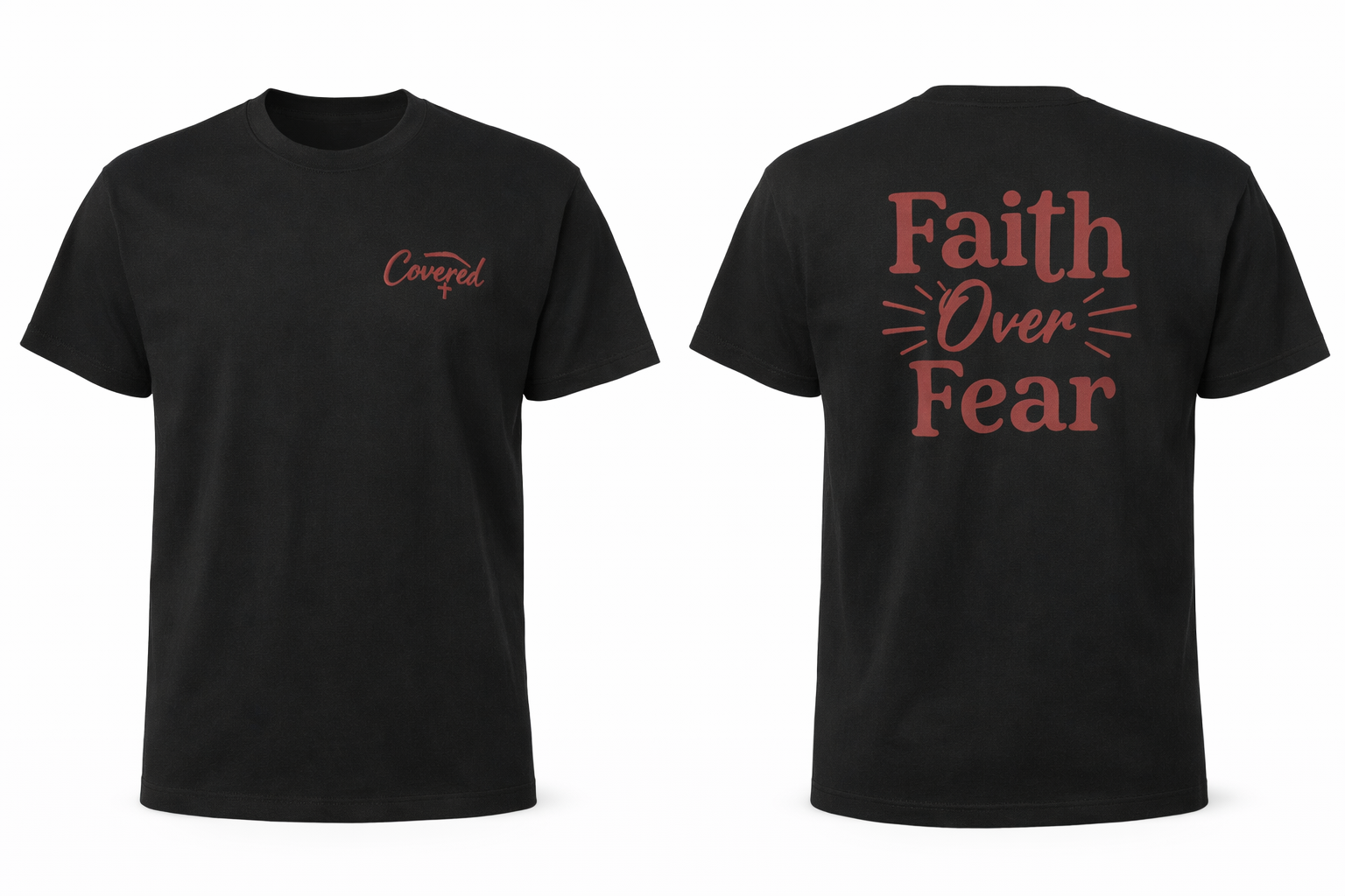 A bold reminder to choose faith every time. This unisex midnight edition tee features our signature “Faith Over Fear” statement on the back with our signature Covered detail on the front. Soft, comfortable, and designed to move with you — wherever faith leads.